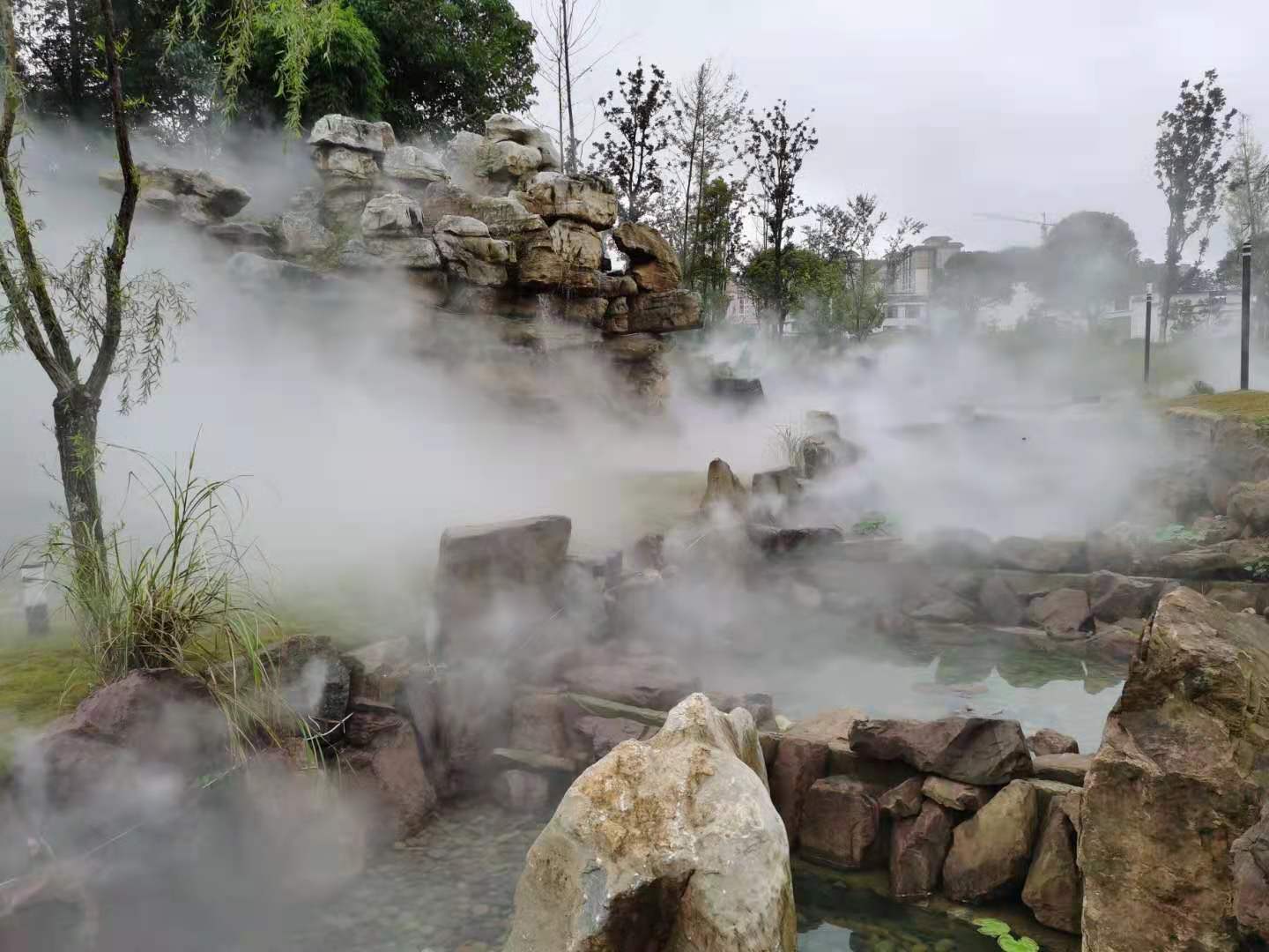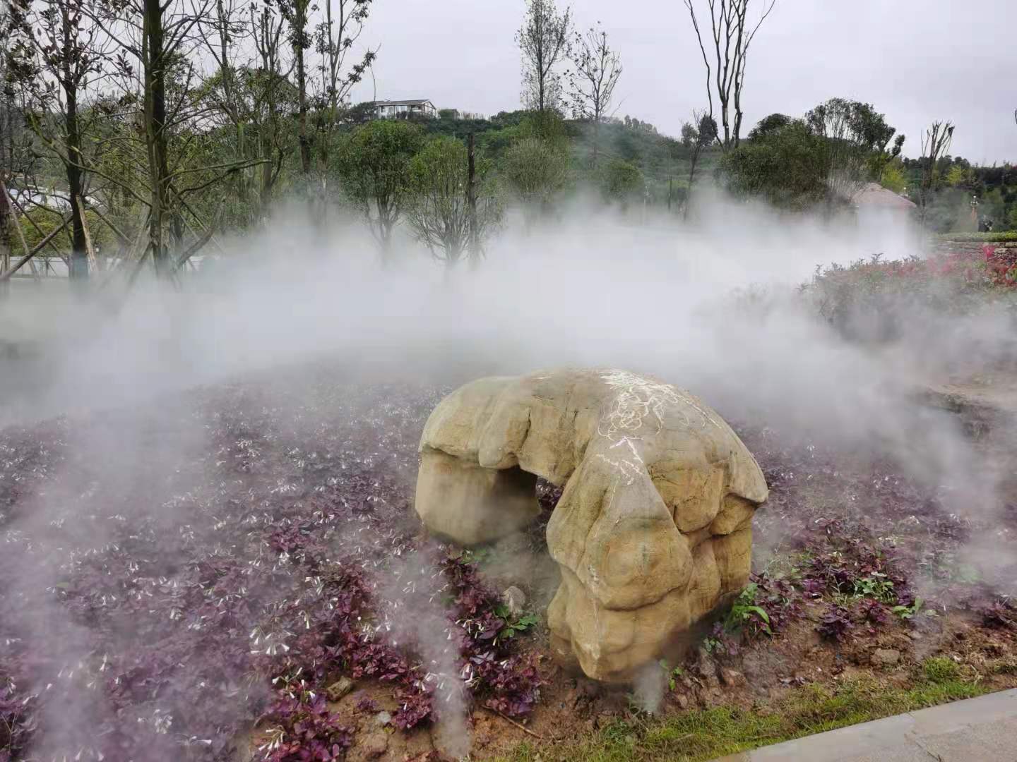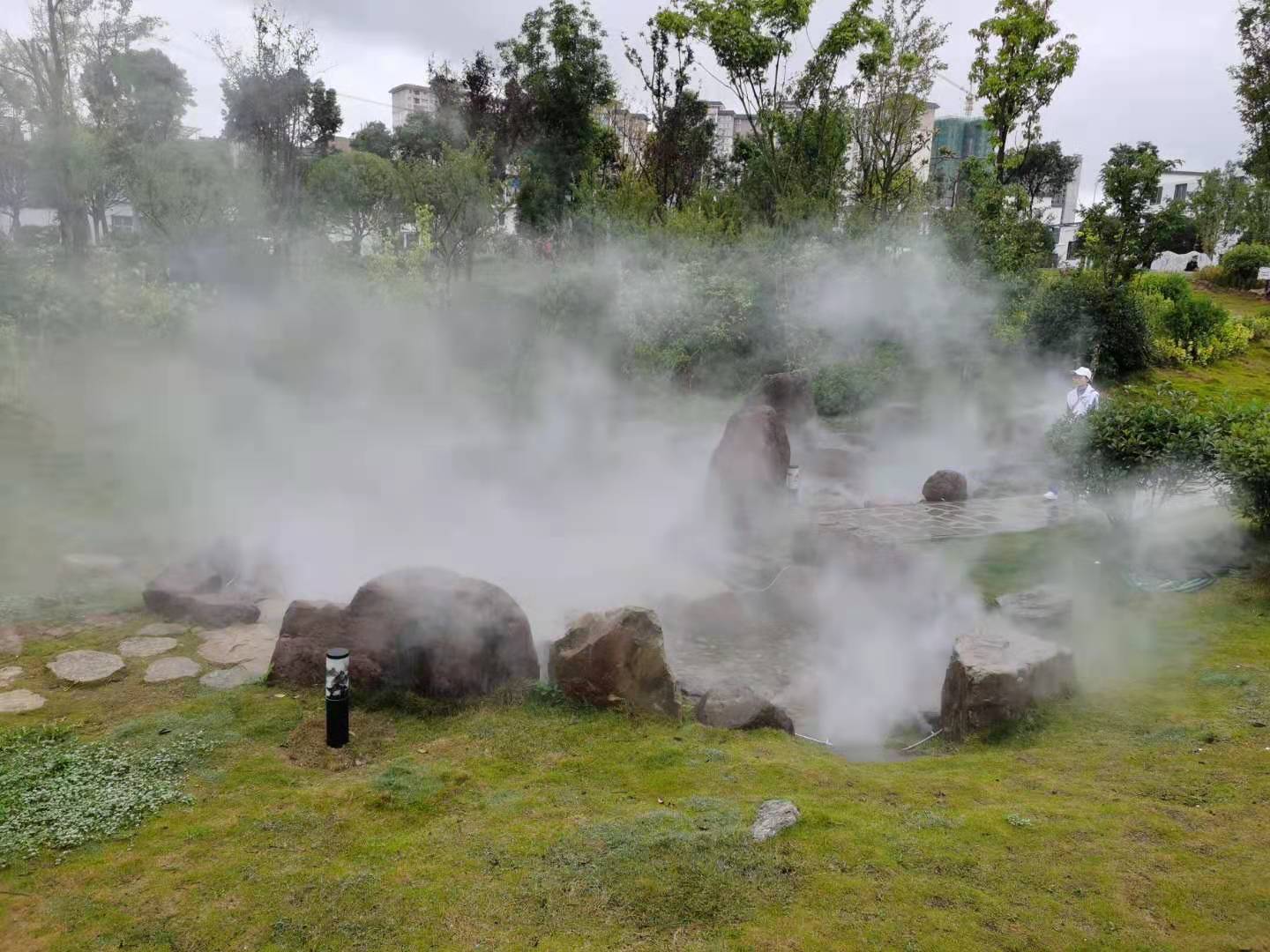 修文玩易窩遺址公園位于修文縣龍場鎮(zhèn)南片區(qū) ,規(guī)劃占地面積113畝,66865平方米綠地面積,是修文市民休閑游玩的一個很好的去處,也是2020年9月29日貴陽市旅游發(fā)展大會的主會場,園區(qū)內(nèi)由我公司設(shè)計施工的冷霧霧森景觀是該園區(qū)一道別致的景觀,冷霧景觀打造分為六個區(qū)域,共六套主機,噴頭1000余套,耗時半個月完成施工,其造景效果得到了甲方和業(yè)主方一致認(rèn)可。