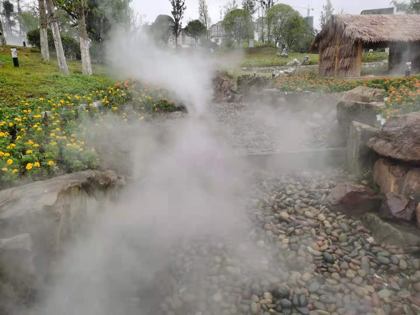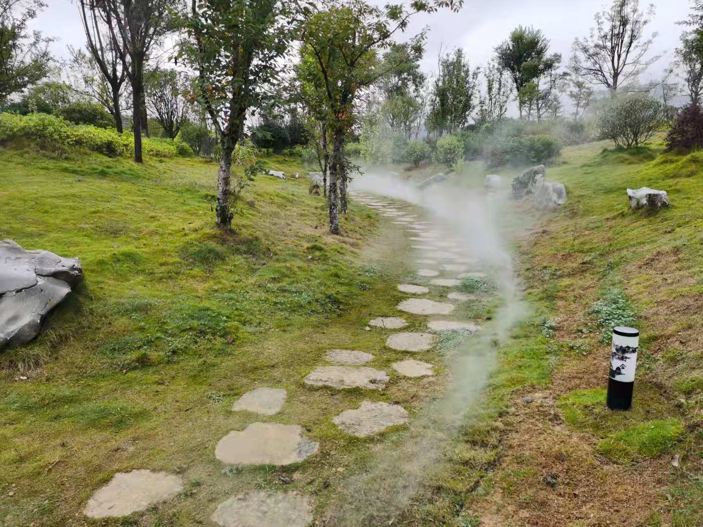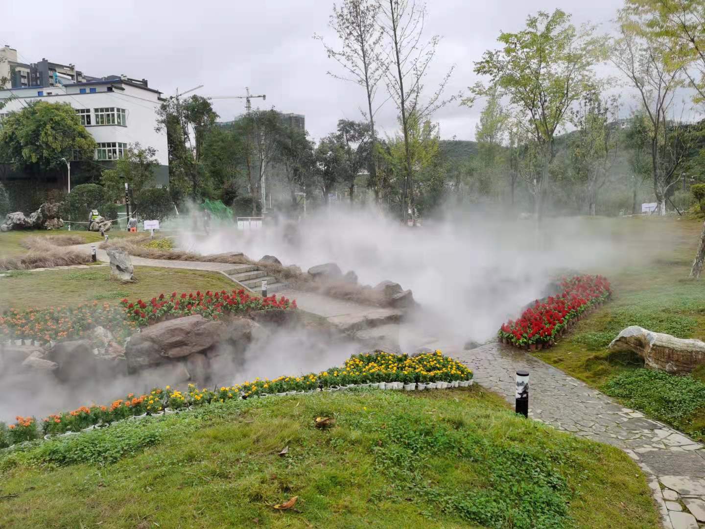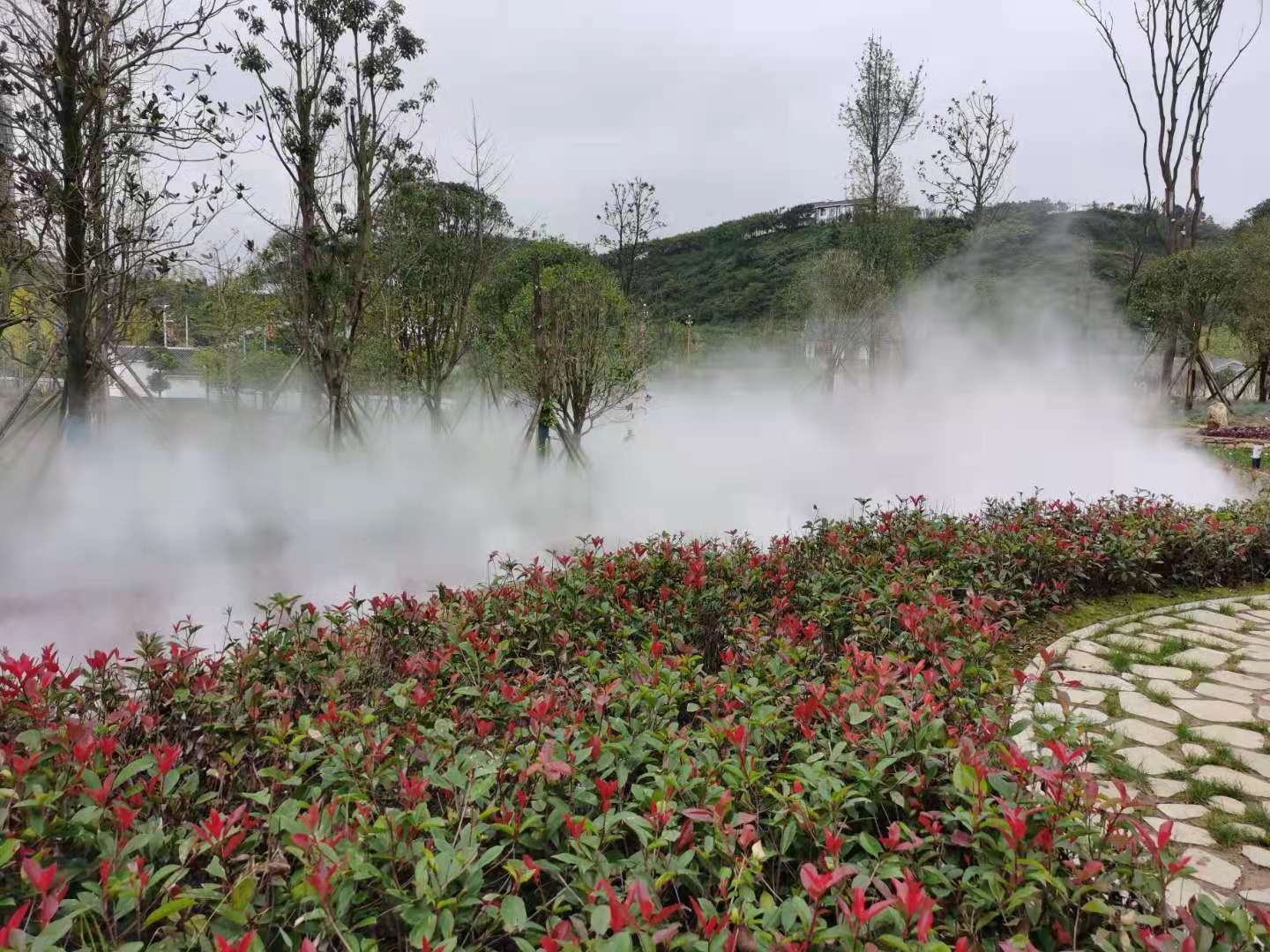 修文玩易窩遺址公園位于修文縣龍場鎮(zhèn)南片區(qū) ,規(guī)劃占地面積113畝,66865平方米綠地面積,是修文市民休閑游玩的一個很好的去處,也是2020年9月29日貴陽市旅游發(fā)展大會的主會場,園區(qū)內(nèi)由我公司設(shè)計施工的冷霧霧森景觀是該園區(qū)一道別致的景觀,冷霧景觀打造分為六個區(qū)域,共六套主機,噴頭1000余套,耗時半個月完成施工,其造景效果得到了甲方和業(yè)主方一致認(rèn)可。